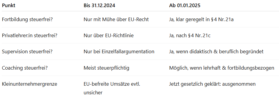 Seit dem 01.01.2025 ist im § 4 Nr. 21 UStG auch die Fortbildung ausdrücklich als steuerbefreite Bildungsleistung aufgenommen. Coaching, das sich klar an beruflicher Weiterentwicklung orientiert, kann also steuerfrei sein, wenn: